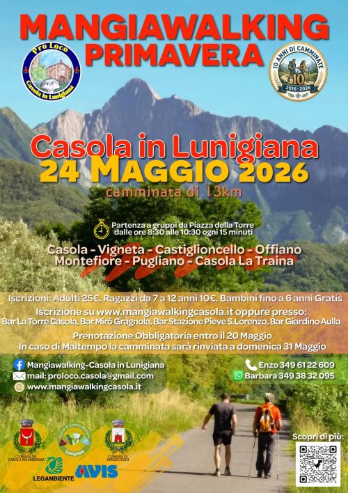 Domenica 24 maggio 2026, a Casola, torna la Mangiawalking, edizione primvarile; e torna festeggiando i dieci anni dedicati a escursionismo, territorio e tradizioni enogastronomiche locali.