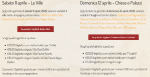- VILLE: tramite visite guidate continuative negli orari 10:00–13:00 e 14:00–18:00. I turni di visita avranno una durata di circa 30 minuti con un massimo di 20 persone per turno.